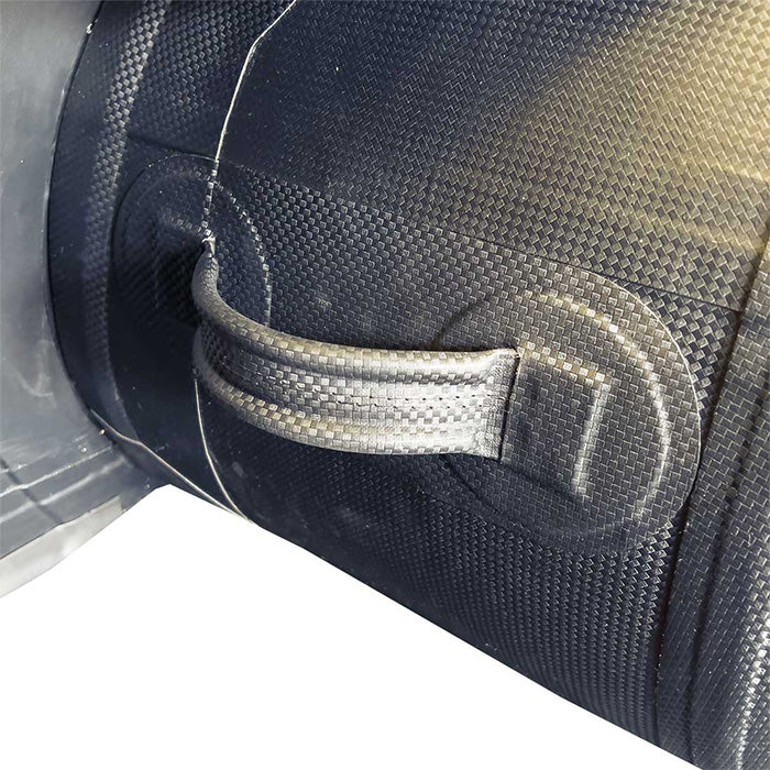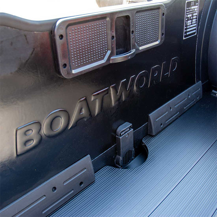 The Boatworld Carbon Pro 400 takes strength and style to the next level with added muscle and innovative features. Built from sleek grey and black carbon-effect Heytex 0.9mm 1100 denier fabric, this boat delivers unmatched durability and comes with a 5-year warranty for total peace of mind. The GRP transom, embossed with the Boatworld logo, and a colour-coded non-slip aluminium floor combine robust functionality with premium design.