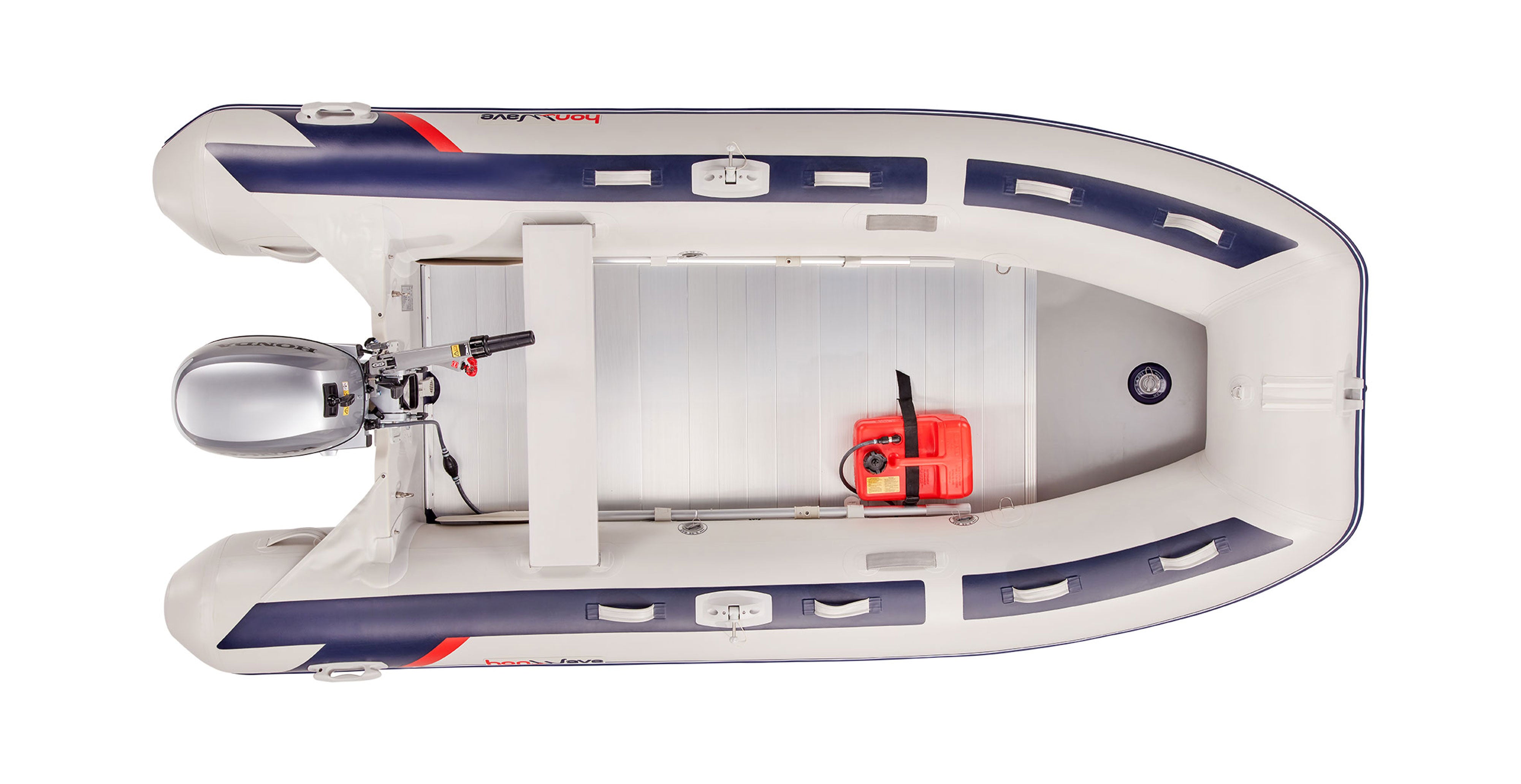 The Honwave Aluminium-Deck inflatables are rugged, versatile, and ready to tackle a wide range of nautical activities. Made from high-quality marine-grade PVC, these boats are designed for maximum durability and usability, offering smooth and safe cruising every time. The T35 AE3 model features a new dynamic design, a GRP transom for exceptional durability, and integrated oar storage to maximise passenger space.