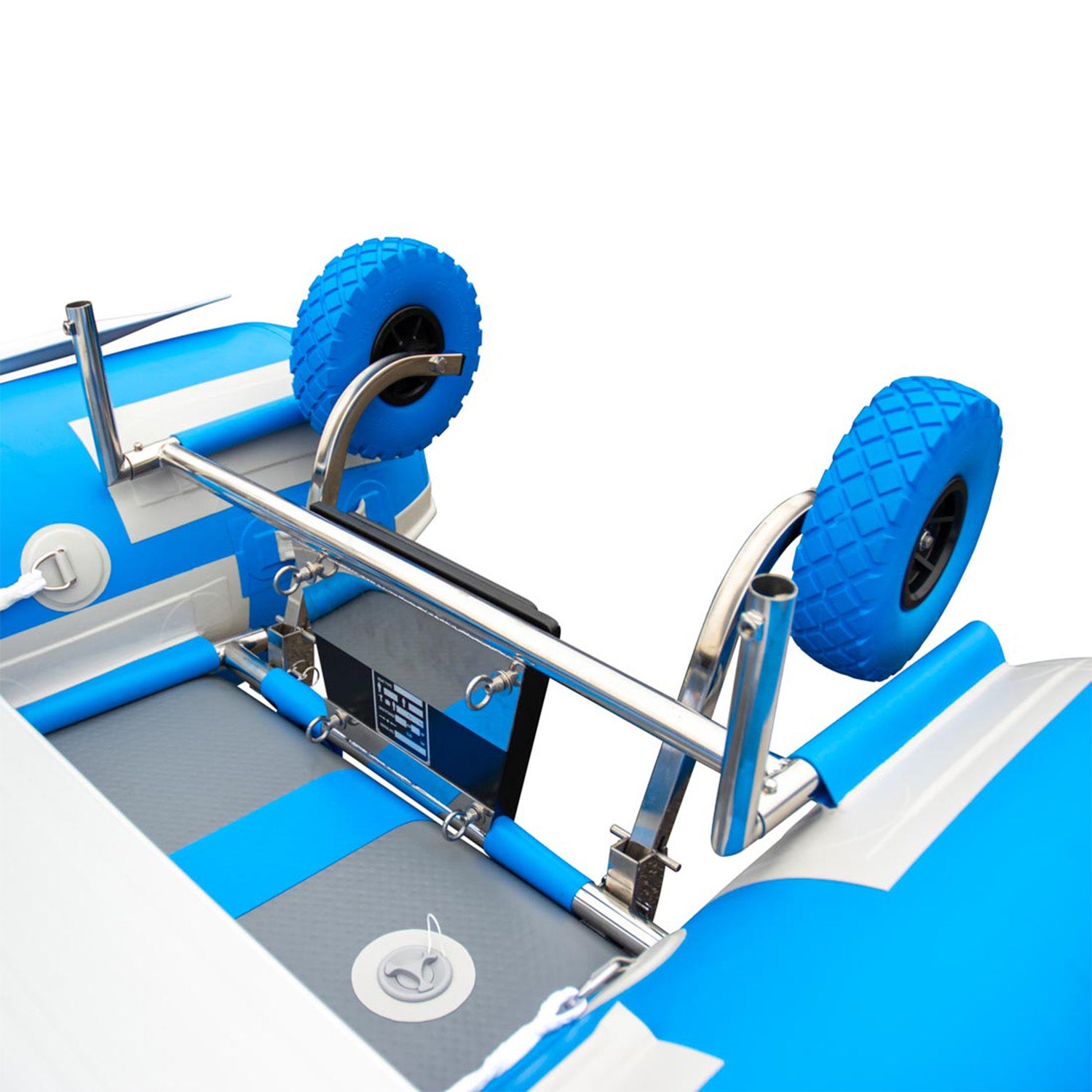 collapsible transom with fitted wheels for easy launching and an open design that allows water to drain out