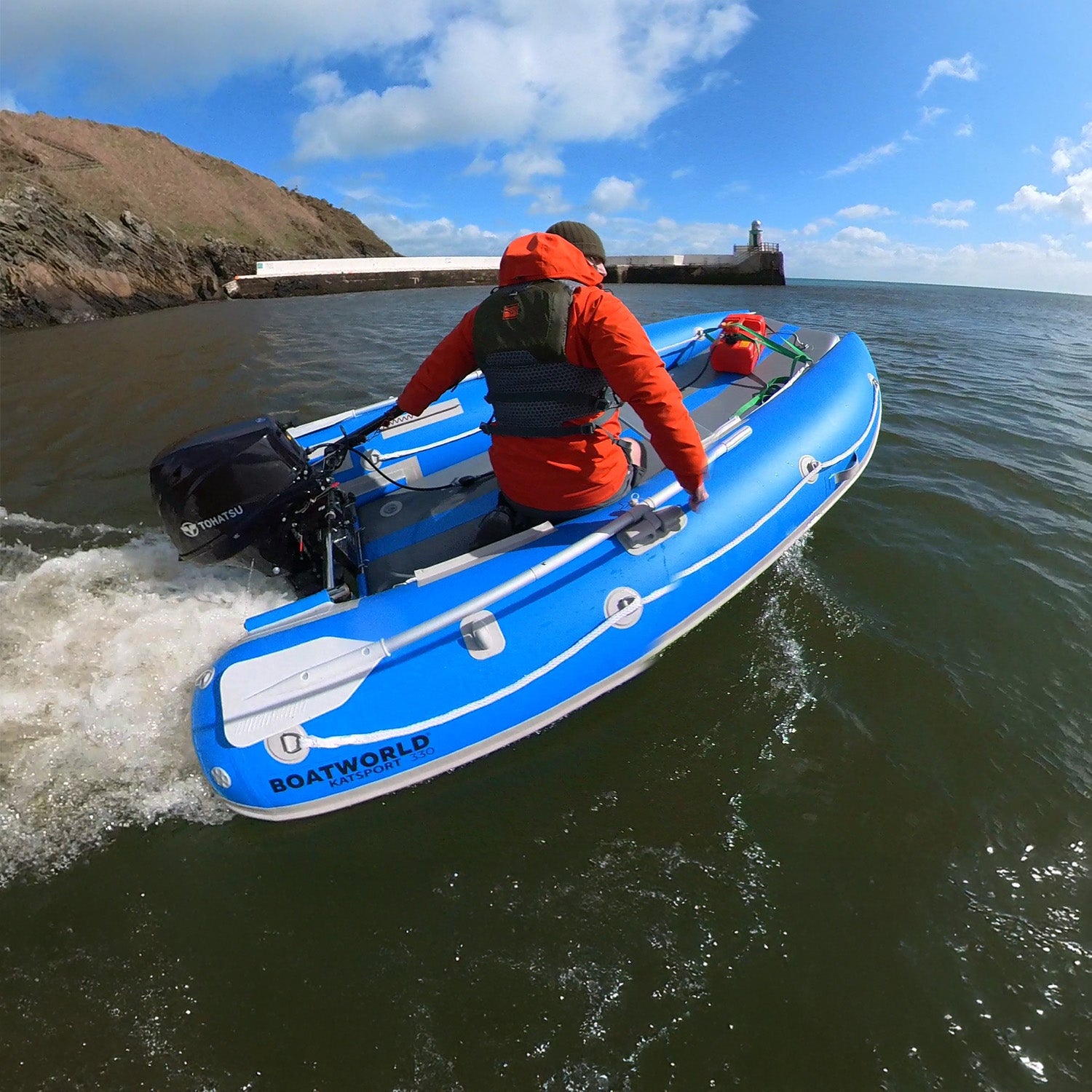 Built for durability, the KAT Sport features super-strong 0.9mm 1100 denier cloth and a high-pressure inflatable boarding deck for comfort and performance. With two aluminium seats, stainless steel launch wheels, and fishing rod holders mounted into the transom as standard, it’s packed with thoughtful features for fishing trips, diving, or family outings. The attachable fin even allows the floor to transform into a paddleboard for added versatility.